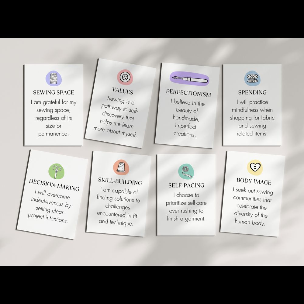 Celebrate sewing and overcome challenges with this set of 48 printable sewing affirmations. Designed to support you at every stage of your sewing journey, you can pull a card whenever you're facing indecision, perfectionism, or just need a little encouragement. Keep them on your sewing table, pinboard, or by your machine for an instant boost of inspiration. What's Included: Instant Digital Download (2 PDF files)48 Unique Affirmation Cards8 Essential Sewing Themes: Includes 6 cards each for Spending, Decision-Making, Perfectionism, Self-Pacing, Skill-Building, Sewing Space, Body Image, and Values.Two Print Formats: Includes files for both sharp and rounded corners.Compact Size: Each card is 2x3 inches. Please Note: This is a digital product. No physical item will be shipped.